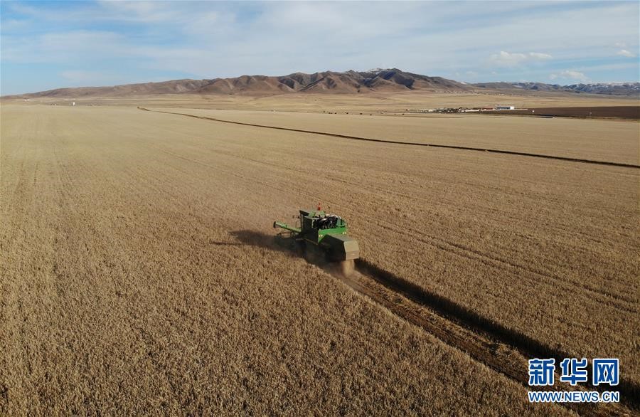 10月17日,在貴南縣過馬營鎮,一臺收割機在田間收割青稞(無人機拍攝)。 深秋時節,在青海省海南藏族自治州貴南縣過馬營鎮,青海省三江集團工人正抓緊時間搶收青稞。據了解,貴南縣過馬營鎮是青海省規模最大的青稞種植基地之一,2018年當地種植青稞超過5.8萬畝。 新華社…