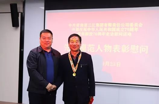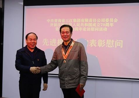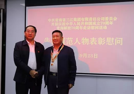 為慶祝中華人民共和國成立70周年,中共中央、國務院、中央軍委為符合條件的人員頒發“慶祝中華人民共和國成立70周年”紀念章。9月23日上午,集團公司黨委精心組織召開被中共中央、國務院、中央軍委授予功勛榮譽表彰獎勵的先進模范人物座談會,為獲得全國勞動模范的河卡種羊場退休職工袁愛善、貴南草業公司退休職工張殿輝、集團公司經營管理部副部長苑剛同志佩戴“慶祝中華人民共和國成立70周年”紀念章,并送上慰問金,把黨的關懷和溫暖及時送到先進模范人物心中。集團公司黨委書記、董事長馬榮華,黨委副書記、總經理李向陽出席會議,黨委副書記祁生珠主持會議。