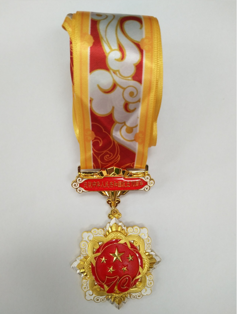 紀念章使用銅胎鍍金材質,通徑為50毫米,主要元素為五星、“70”飄帶、團錦結、如意祥云和光芒,主色調為紅色和金色。核心部分為五星,代表國家榮譽。“70”飄帶象征中華人民共和國70年奮斗歷程。團錦結環繞在五星和“70”飄帶周圍,寓意全國各族人民大團結,構建人類命運共同體的愿景。章體外環以如意祥云、光芒構成,象征人民對美好生活的向往,同時表達隆重慶祝中華人民共和國生日,禮贊國家富強、民族振興、人民幸福的輝煌成就,以及在70年輝煌奮斗成就的基礎上不忘初心、繼續前進的堅定決心。