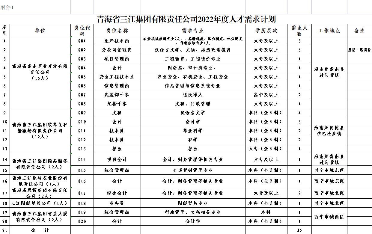 此次擬招聘20個崗位35人,具體內容詳見附件1,即《青海省三江集團有限責任公司2022年度人才需求計劃表》。