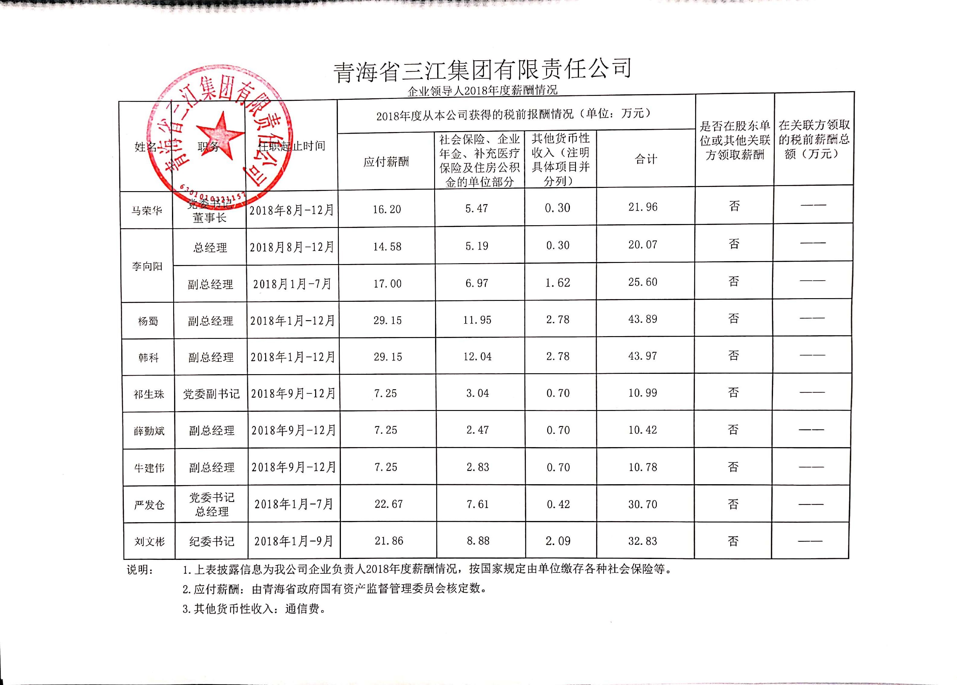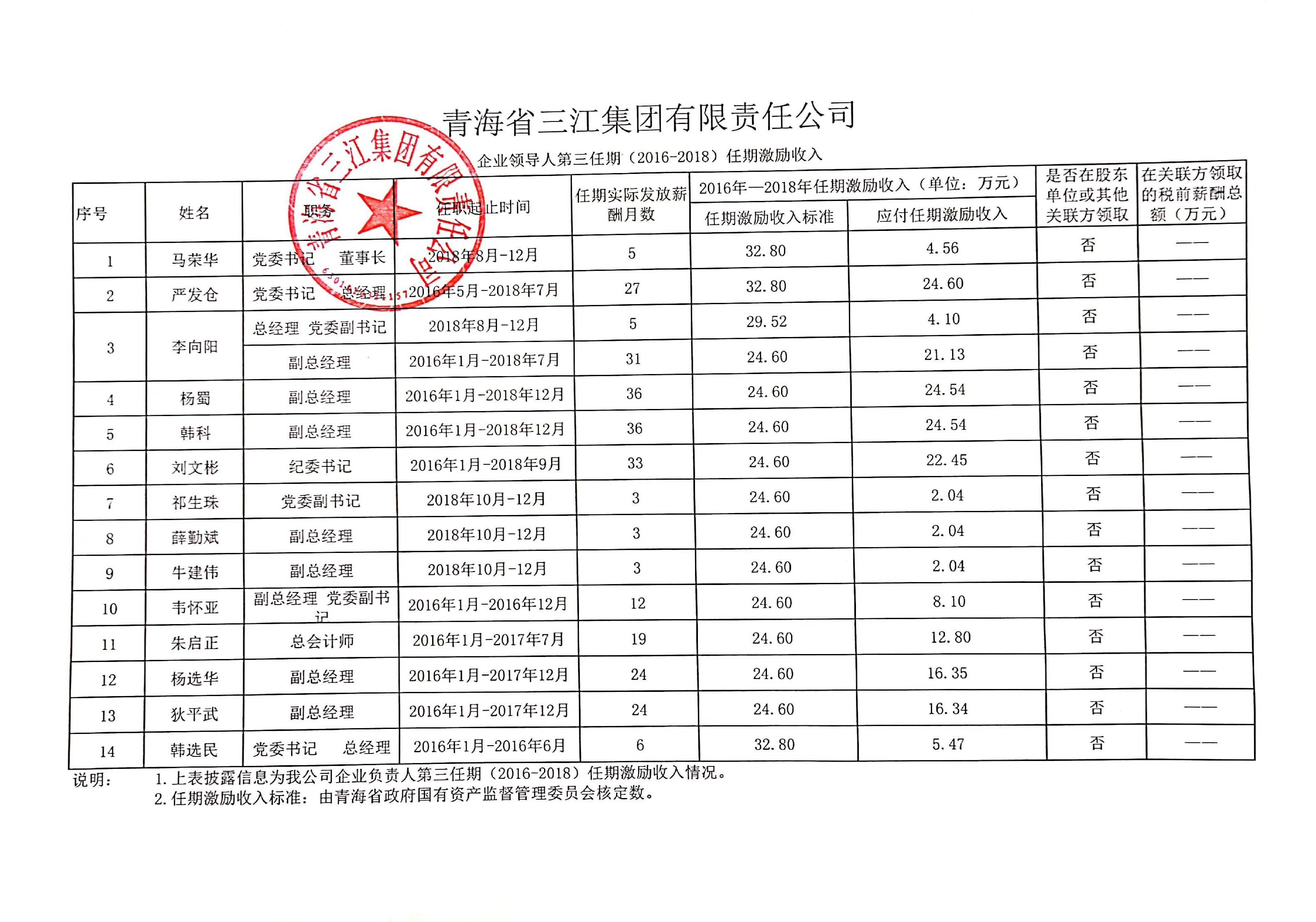 三江集團企業領導人2018年度薪酬情況及(2016-2018)任期激勵收入情況