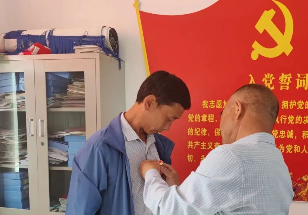 ▲為轉(zhuǎn)正預備黨員王勝明佩戴黨徽